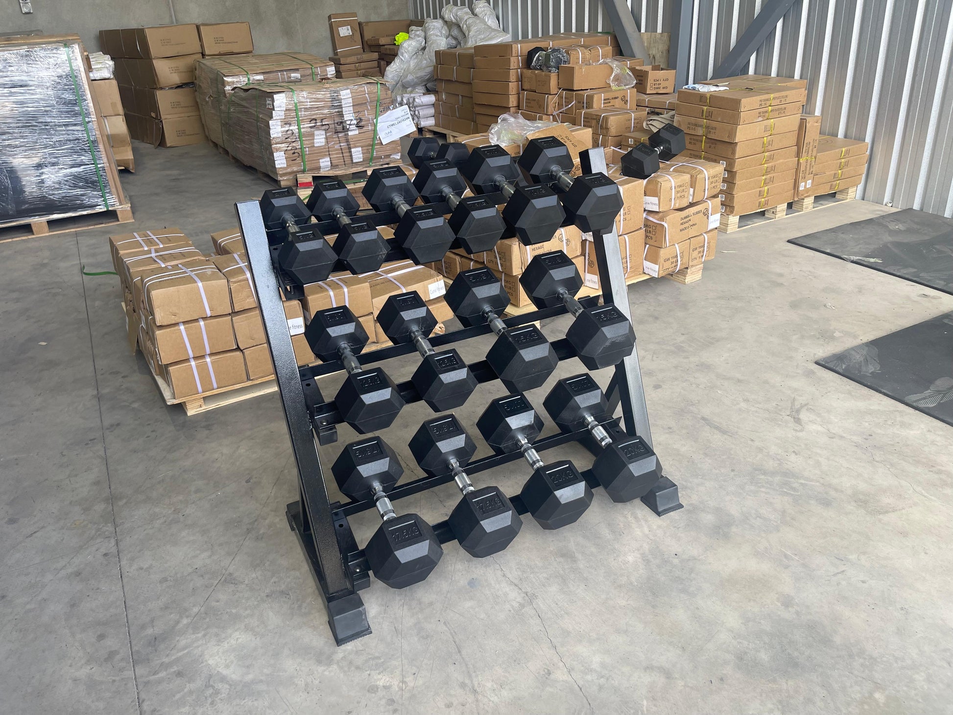 The premium Rubber Hex Dumbbells offer durability, low odour, and a secure knurled grip for confident handling at every weight. Paired with a robust 110cm 3-Tier Rack, you get a clean, organised, and professional-looking layout for your home or studio gym.