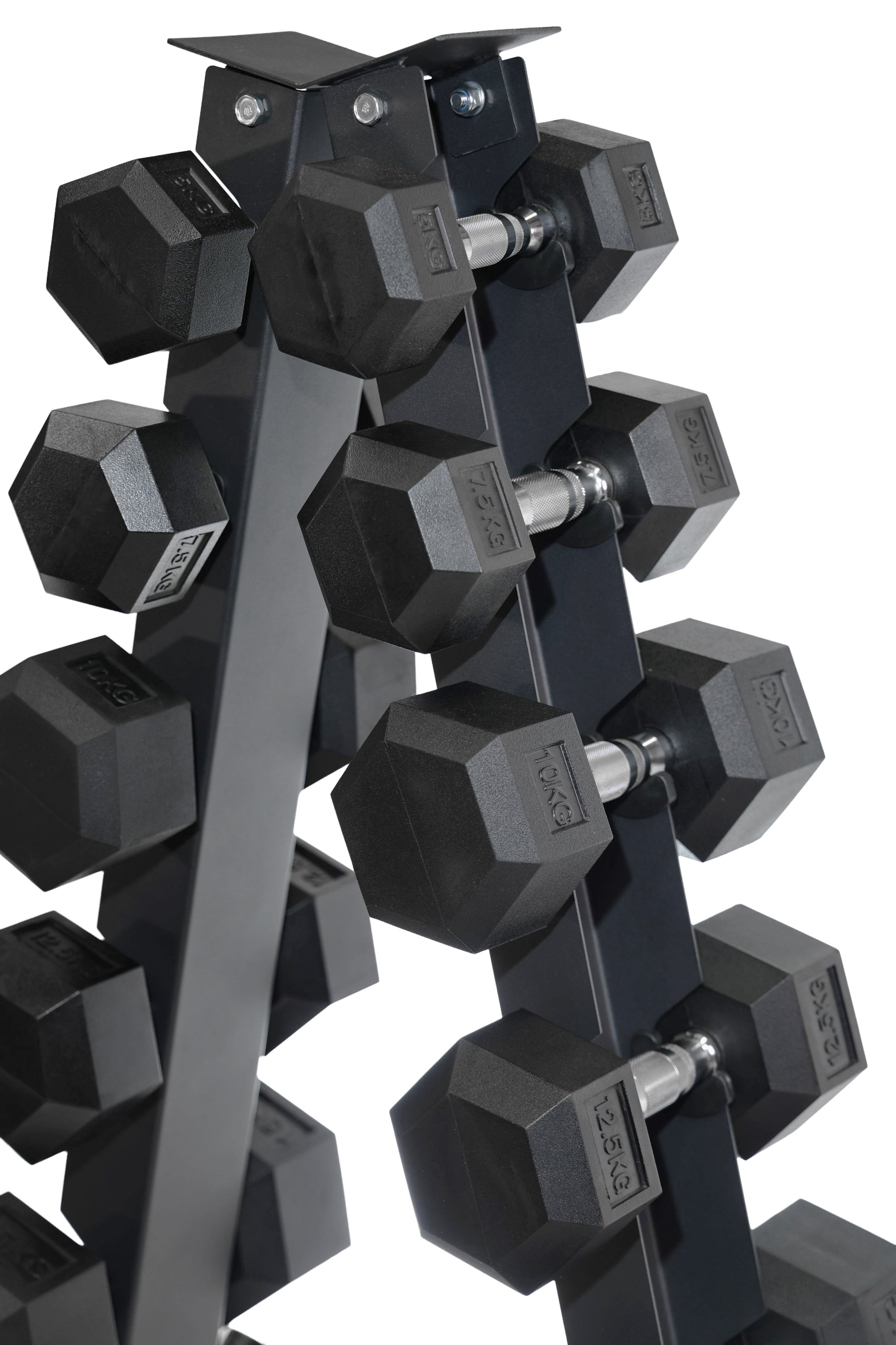 Each dumbbell features rubber-hex heads for long-lasting durability and floor protection, while the knurled steel handles ensure a secure, non-slip grip during every lift. The included rack keeps your dumbbells organised and easy to access — helping maintain a clean, safe gym space.
